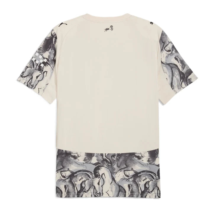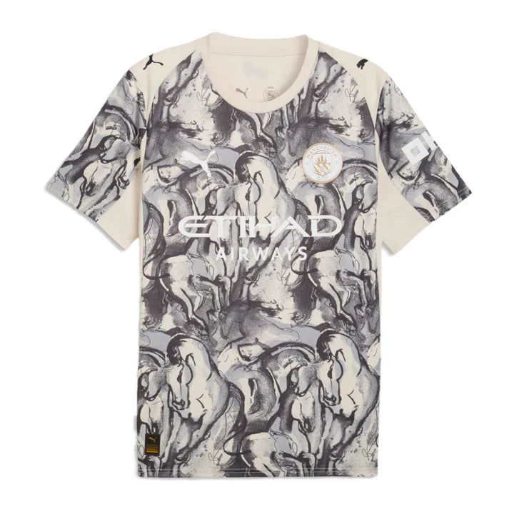 The 2025–26 Special Edition kit of Manchester City FC is a modern and innovative football shirt created in collaboration with Puma and EA Sports FC 26. The kit has a dark forest-green base with turquoise and metallic triangular graphics, giving it a futuristic look. A unique feature of the shirt is the NFC chip inside the club crest, which allows fans to tap their phone on the badge to unlock exclusive digital content and rewards in the game.